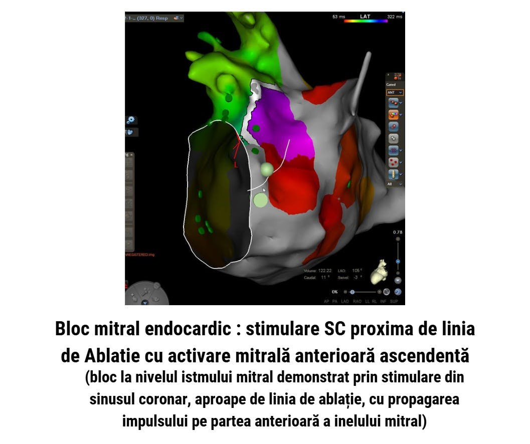 - După alcoolizare, mappingul a arătat apariția unei zone de scar în regiunea istmului mitral; s-a completat ablația endocardică pentru obținerea blocului.