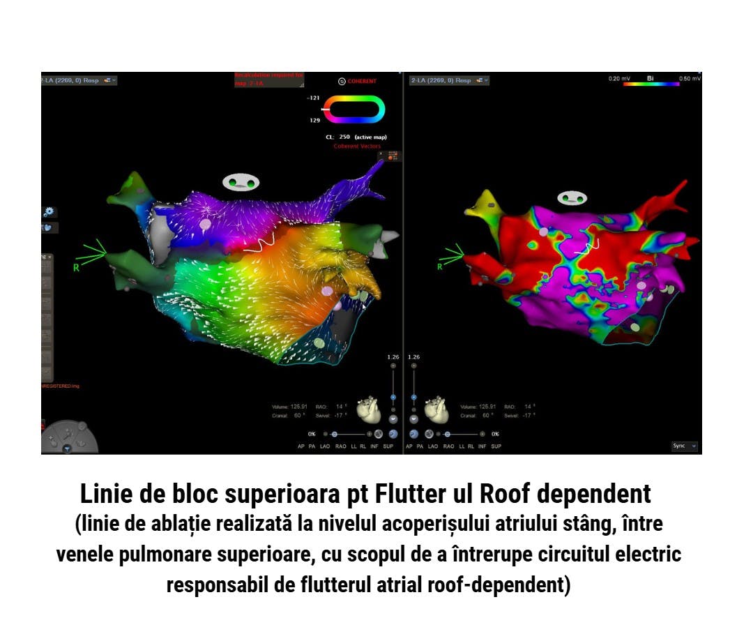 - Cartografiere electrică (mapping) 3D a atriului drept și apoi a atriului stâng cu sistem CARTO (Biosense), pentru a identifica exact circuitul aritmiei.