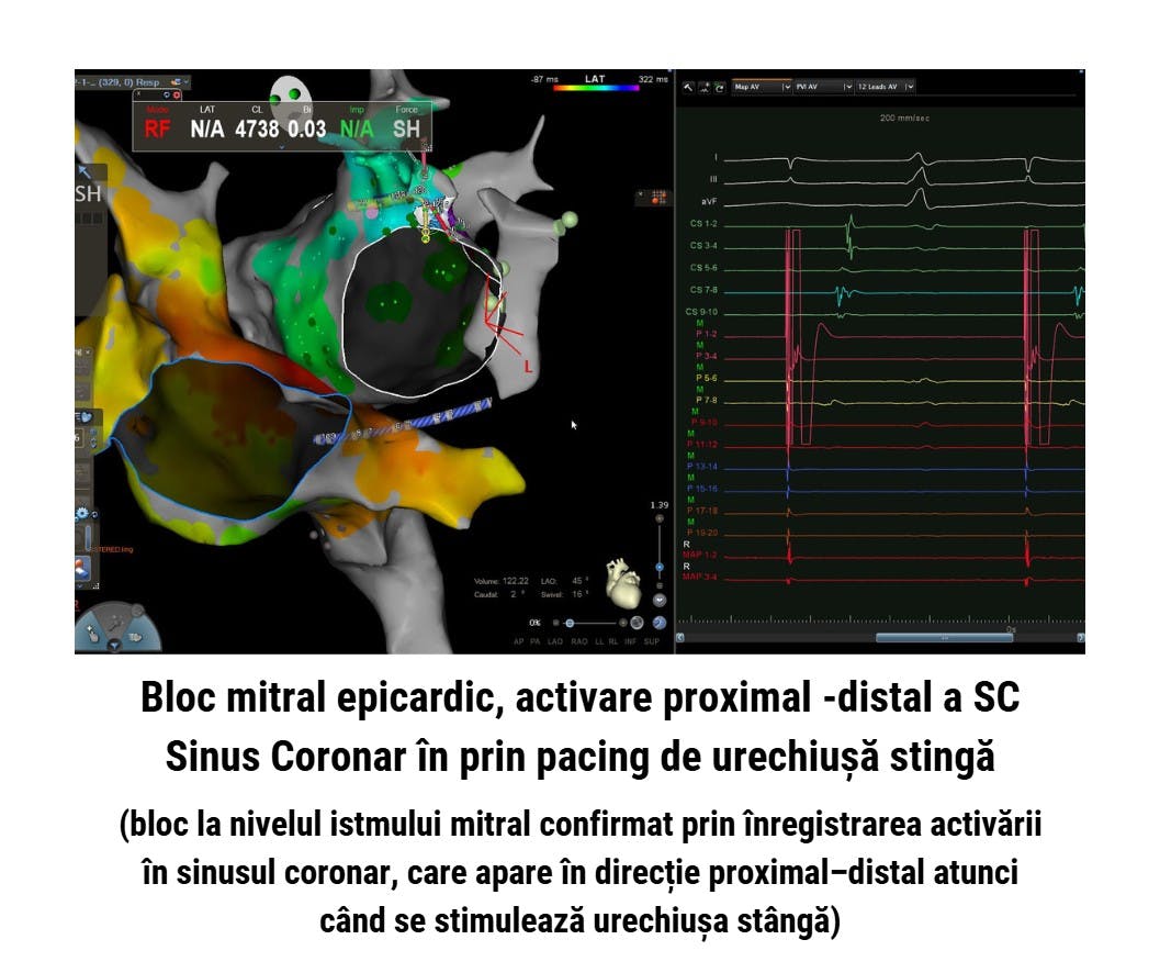 Rezultat procedural: ablație de fibrilație atrială persistentă și flutter atipic perimitral cu alcoolizare de venă Marshall și bloc mitral epi-endocardic complet.