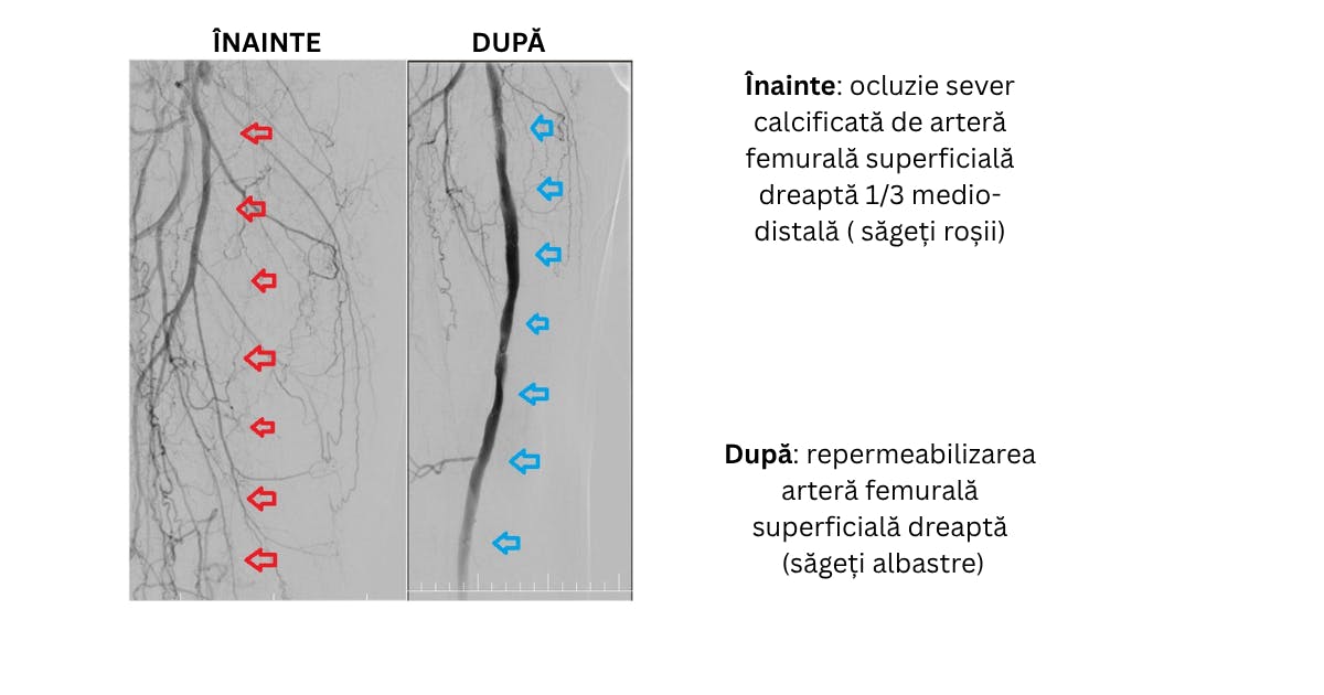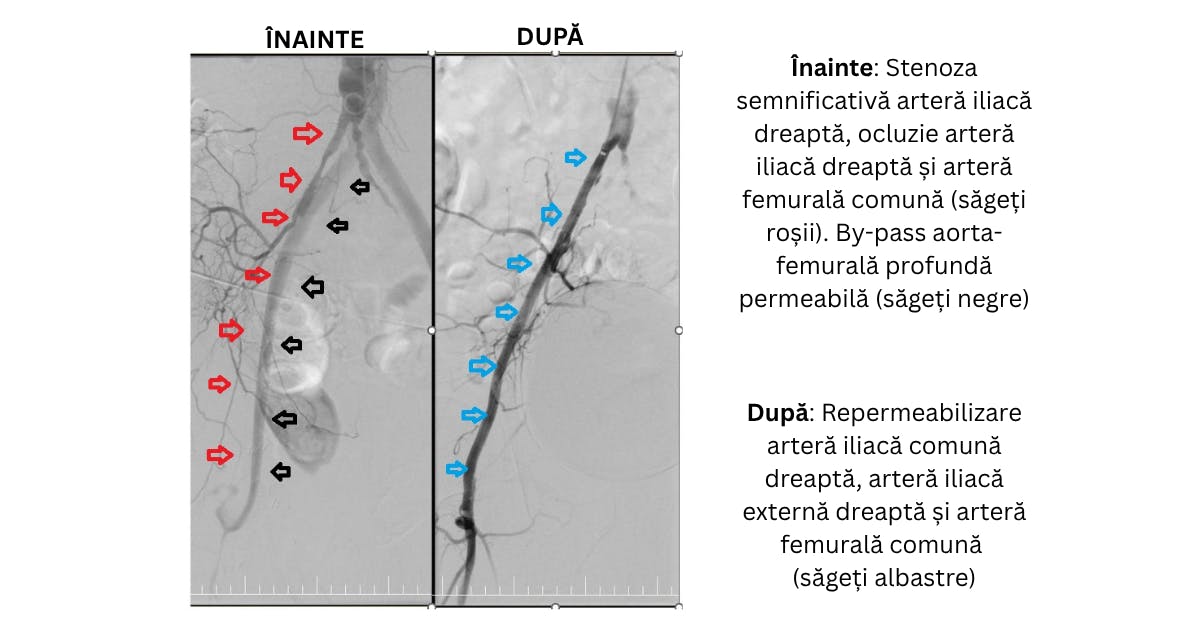 Prin tehnici avansate de recanalizare CTO (Chronic Total Occlusion), Dr. Cârstea a reușit să restabilească fluxul sanguin prin arterele native, iliace, femurale și poplitee, fără chirurgie deschisă.